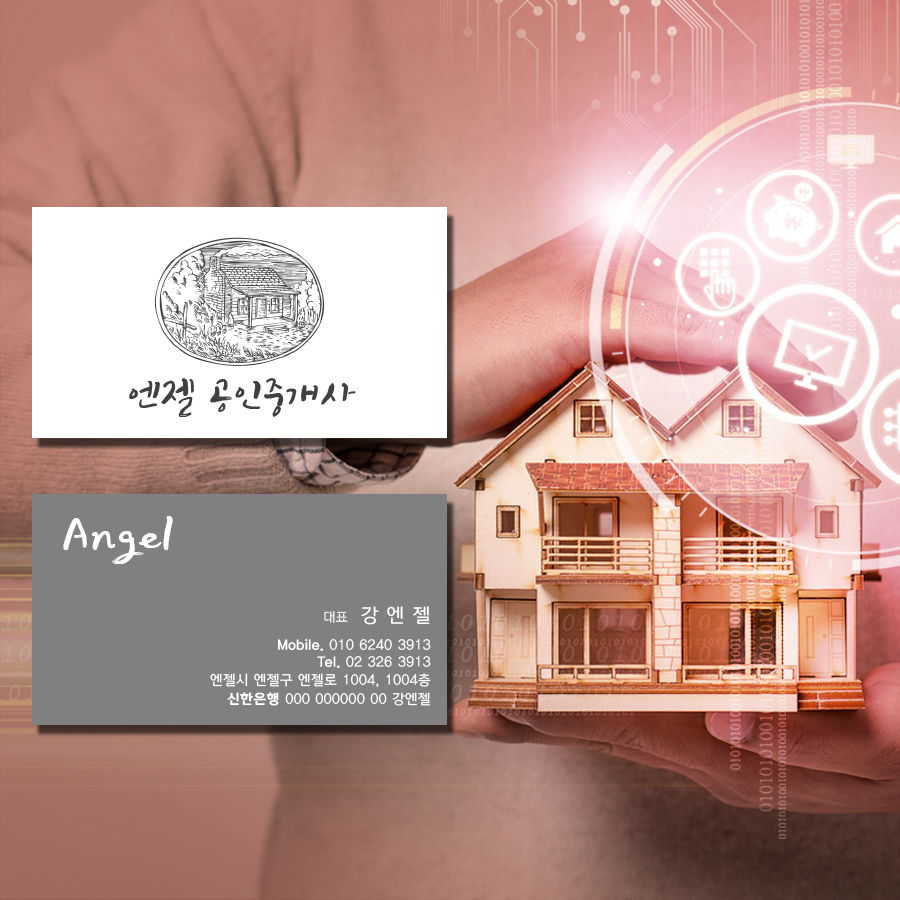 지금 보시는 디자인은 연한 하늘색 톤을 사용해 집 모양을 누끼 처리한 부동산 명함 디자인이에요. 배경과 집 이미지를 깔끔하게 분리해 배치하면서 전체적으로 가볍고 산뜻한 인상을 주도록 구성했고, 부담 없이 손이 가는 분위기가 특징입니다.