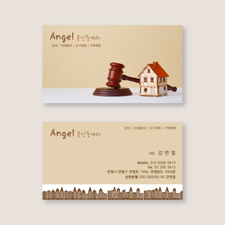 앞면에는 법정에서 판사가 확정을 선고할 때 사용하는 봉(의사봉) 모티브를 넣어, 계약·권리 관계·법률 검토에 능숙한 중개사라는 메시지를 상징적으로 표현했어요. 뒷면 역시 같은 베이지 컬러 톤을 유지하면서 건물 이미지를 빼곡하게 배치해 실무 중심의 탄탄한 이미지를 더했습니다. 앞·뒷면 모두 톤을 통일해 전체 명함의 완성도도 깔끔하게 맞췄고요.