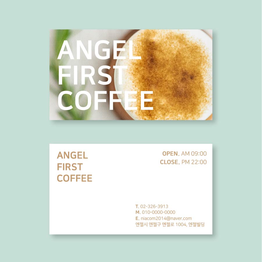 이번에 소개해 드릴 디자인은 베이커리 명함으로 적용해볼 수 있는 감성 카페 스타일 디자인입니다. 앞면에는 디저트 또는 커피 이미지를 디스플레이해 브랜드의 무드를 직관적으로 보여주었고, 특히 ANGEL FIRST COFFEE 문구를 부각시켜 브랜드 메시지가 한눈에 들어오도록 구성했습니다.