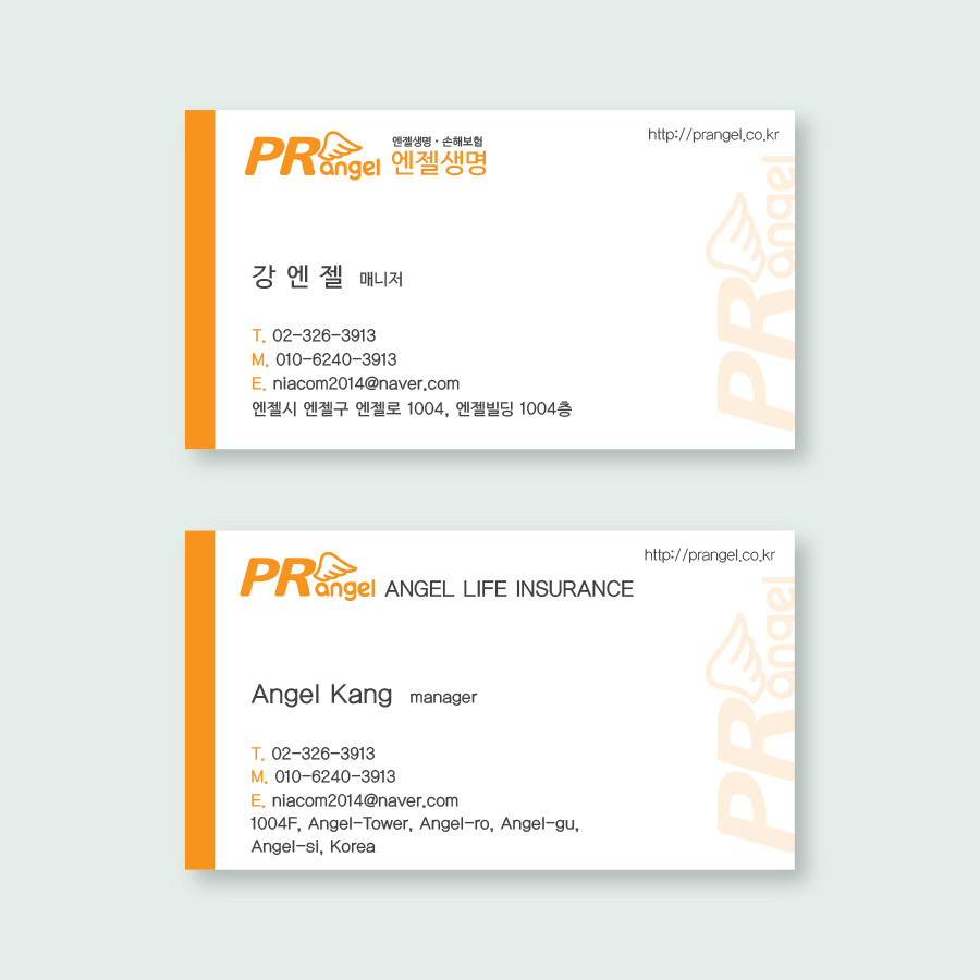지금 보시는 보험사 명함 역시 소속 보험사의 포인트 컬러를 활용해 로고를 강조한 디자인입니다.이번 디자인의 가장 큰 특징은 앞면은 한글, 뒷면은 영문으로 구성했다는 점입니다. 앞면에서는 국내 고객을 위한 명확한 정보 전달에 집중하고,