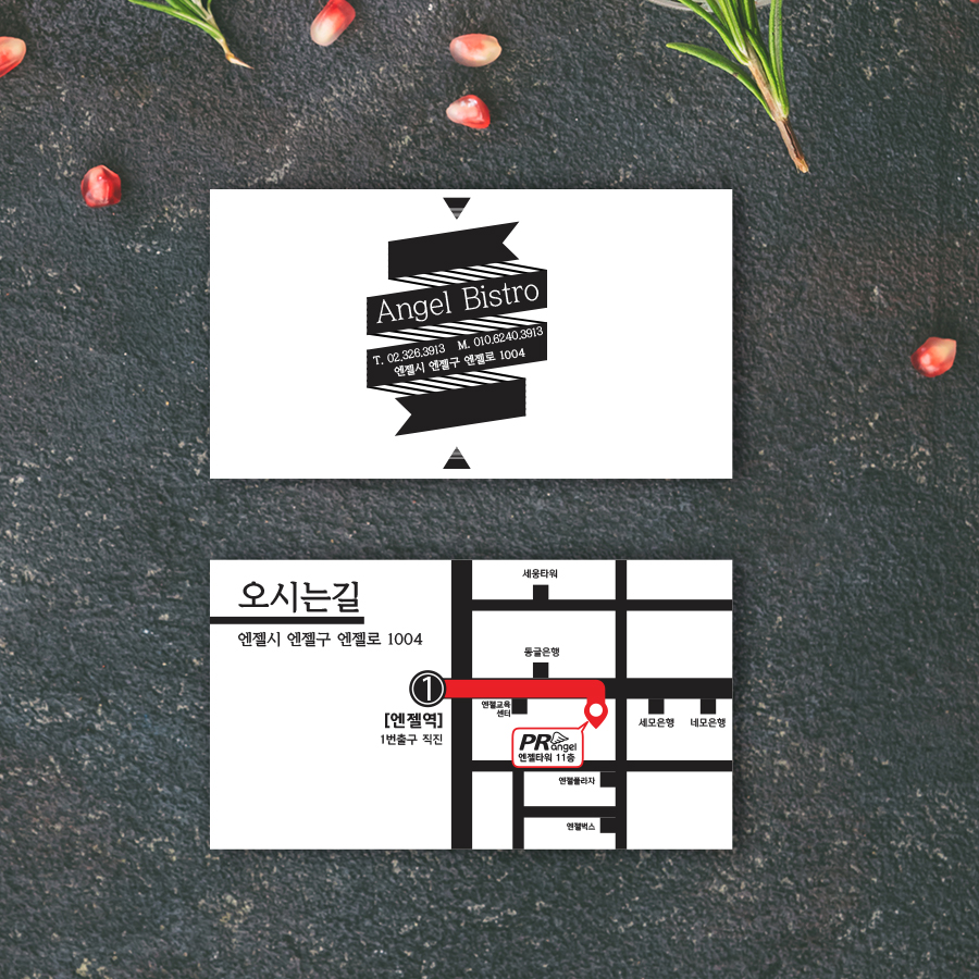 매장의 상호와 연락처 등 필수 정보가 잘 보이도록 구성되어 있어 실제 영업 현장에서 활용하기에도 좋은 스타일이라고 할 수 있습니다. 뒷면은 흰색 바탕에 검은색 컬러를 사용해 깔끔하게 약도를 제작했습니다.