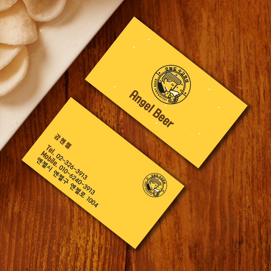 디자인적인 포인트는 맥주 거품을 표현한 디테일입니다. 흰색 점을 활용해 맥주 거품이 살짝 묻어나오는 느낌을 주어 호프집 특유의 분위기를 재미있게 살려보았습니다. 이처럼 업종의 분위기를 직관적으로 전달하는 요소가 들어가면 명함 한 장만으로도 매장의 이미지가 더 쉽게 기억되는 장점이 있습니다.