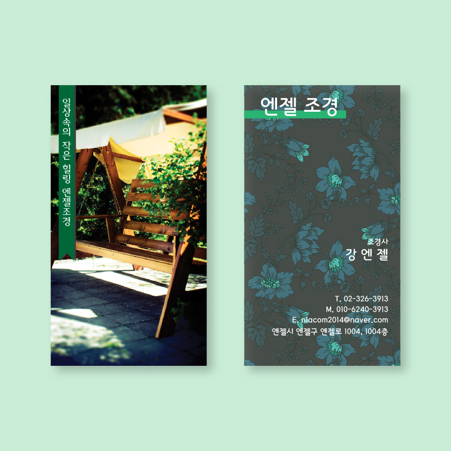 앞면에는 감성적인 벤치 이미지를 활용해 자연 속에서 느껴지는 여유로운 분위기를 담아냈고, 뒷면에는 녹색 패턴을 더해 전체적으로 편안하고 안정감 있는 인상을 주는 디자인으로 완성했어요. 자연 친화적인 브랜드 이미지를 전달하고 싶으신 꽃가게나 조경 관련 업종에 잘 어울리는 명함 디자인입니다 🌿