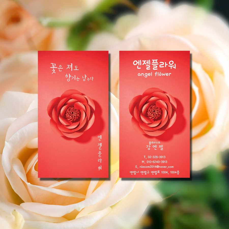 다음으로 소개해드릴 꽃가게 명함은 톤 다운된 레드 컬러로 제작된 디자인이에요. 강렬한 레드 컬러가 주는 인상은 분명하지만, 채도를 낮춰 부드럽게 표현되어 전체적으로는 여성스럽고 우아한 분위기가 함께 느껴지는 것이 특징입니다.